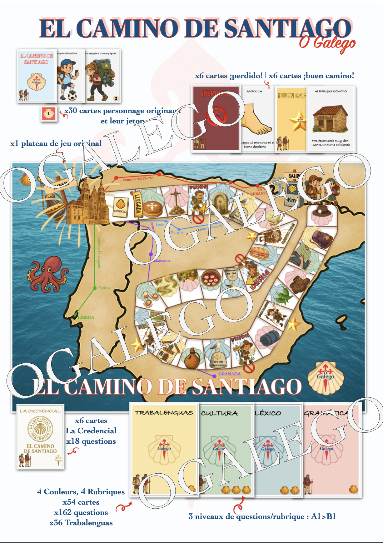 Les élèves avancent sur un plateau représentant l’Espagne, piochent des cartes Gramática, Léxico, Cultura et Trabalenguas, rencontrent des bonus (Buen Camino) et des malus (Perdido), tout en découvrant le célèbre chemin de pèlerinage.