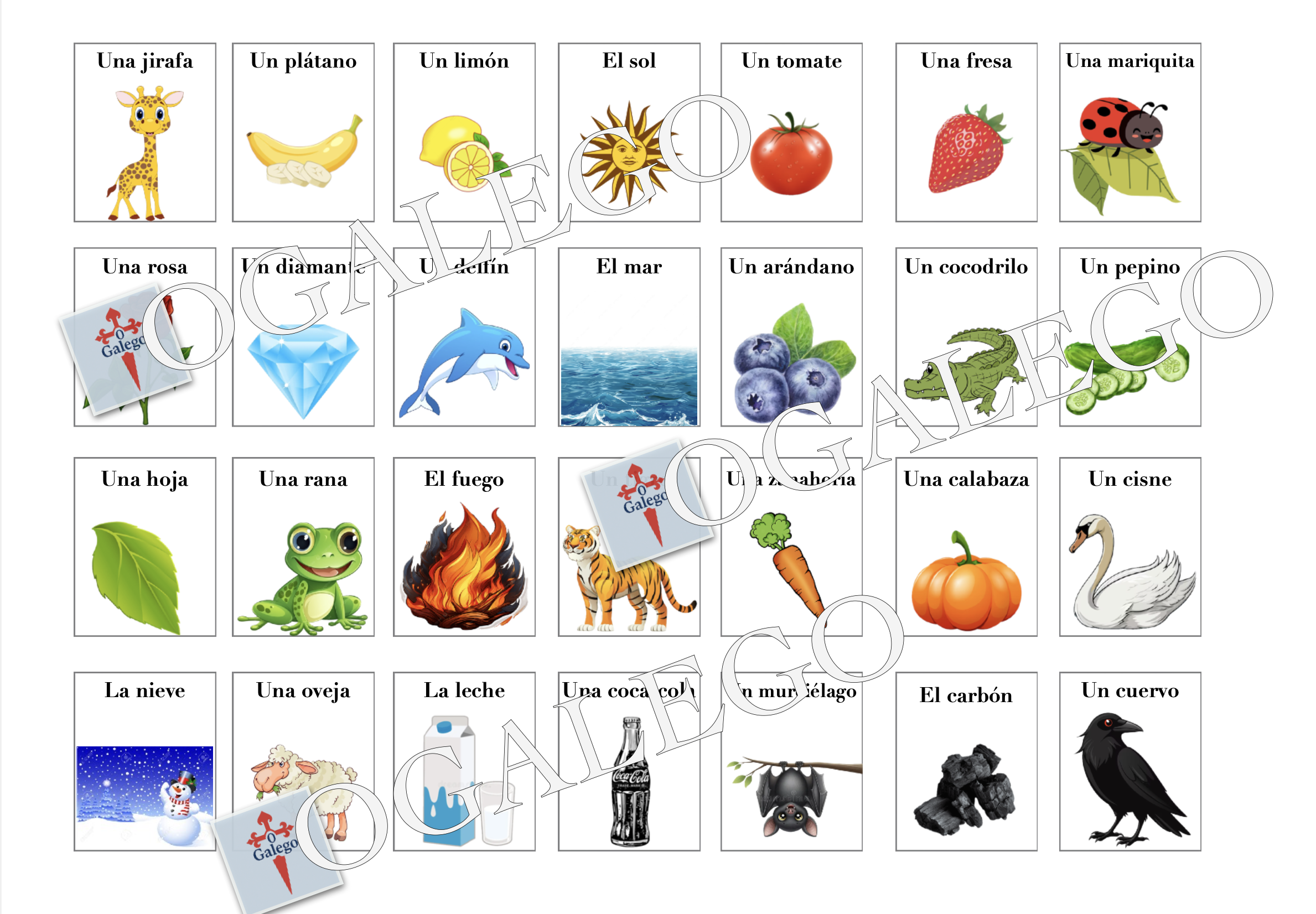 - 28 cartes illustrées (animaux, aliments, objets, nature…)